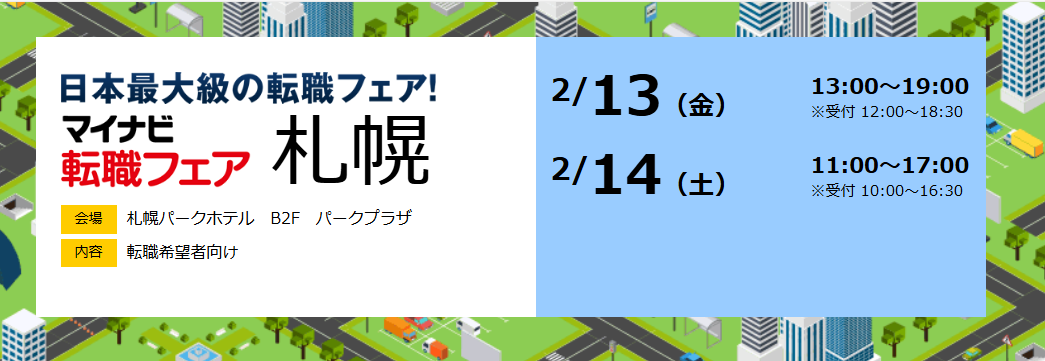 2026年2月14日(土)、札幌パークホテルにて開催される合同企業説明会「マイナビ転職フェア札幌」 に出展します。